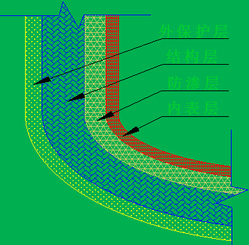 玻璃钢容器罐壁通常由内表层、防渗层、结构层和外保护层组成。管壁结构如图: