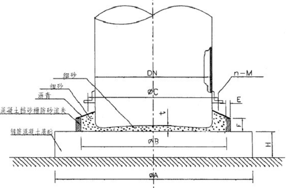 K、将熔化的沥青浇注在贮罐底周围,以防止砂子流失(也可做成挡砂槽)。