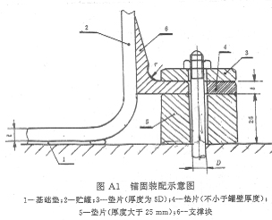 5.2)用锁紧凸块将贮罐锚固在基础上。锁紧的凸块用垫片塞紧,应防压载转移到罐壁上。见图A1。